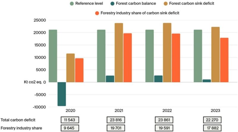 Karkea arvio metsäteollisuuden vaikutuksesta puuttuviin metsänieluihin, arvioitu suhteessa ”ei velkaa”-viitetasoihin. Lainattu artikkelista “Mastering emissions, masking sinks: Finnish Energy-intensive Natural Resource-based Industries low-carbon roadmaps”.