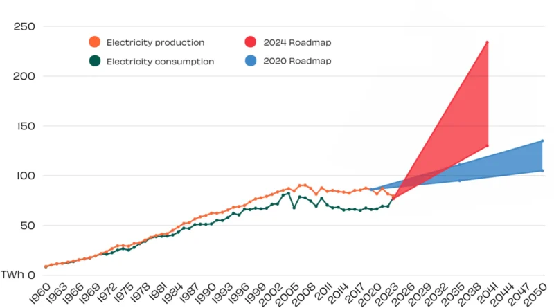 Teollisuuden tiekarttojen skenaariot sähkön tuotannon ja kulutuksen kehityksestä; lainattu artikkelista “Mastering emissions, masking sinks: Finnish Energy-intensive Natural Resource-based Industries low-carbon roadmaps”.
